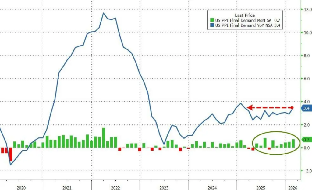 数据显示,美国2月生产者价格指数(PPI)环比上涨0.7%,预期值为0.3%,前值为0.5%;同比涨幅达到3.4%,创下一年来新高,预期值为2.9%。